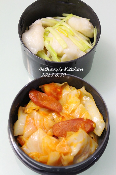 懒人便当又出炉....韭黄炒龙俐鱼块+番茄包菜炒香肠~