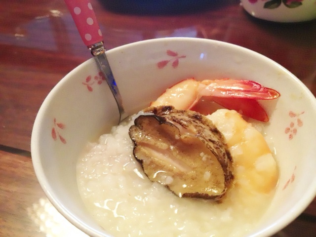 我还是喜欢原汁原味的东西,新鲜捕获的鲍鱼跟虾从青岛送来,晚上整颗用来煮粥,鲜甜