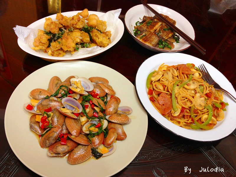 盐酥鸡 九层塔炒花蛤 煎龙利 拿波里意面