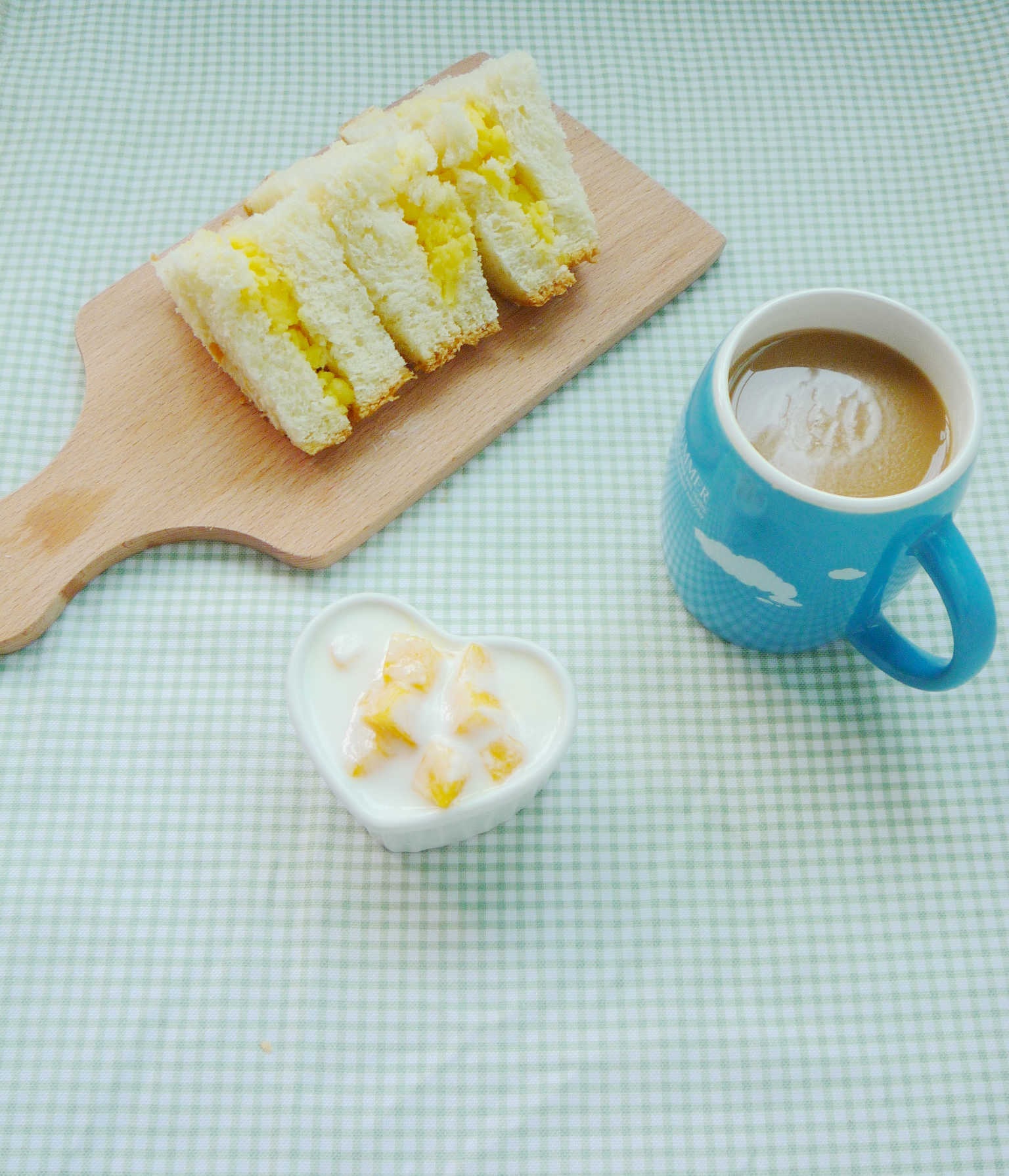 做奶黄冰皮月饼失败的奶黄馅儿用来夹面包刚刚好~配上芒果酸奶和咖啡~