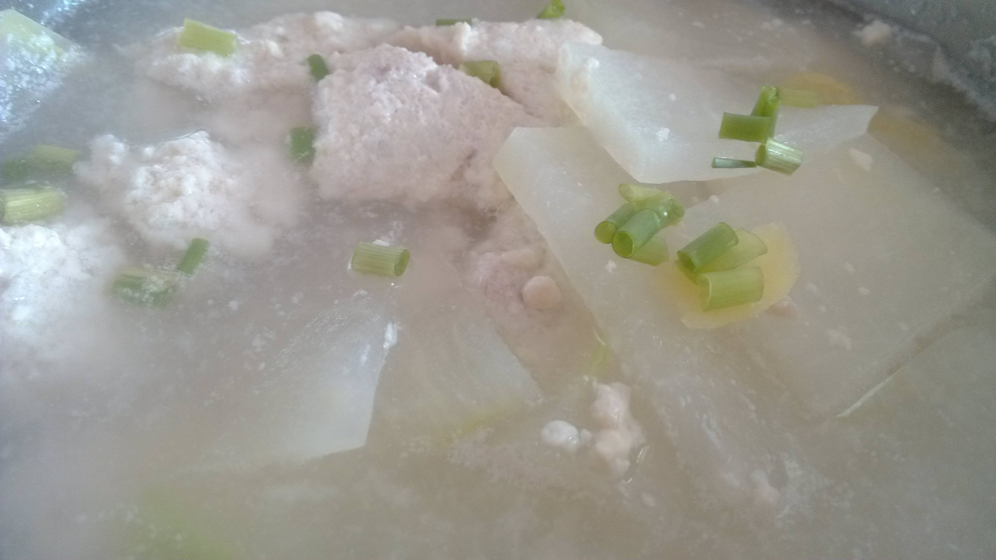 肉丸下锅,不圆了,不过不影响吃,肉丸放了鸡蛋,很嫩。