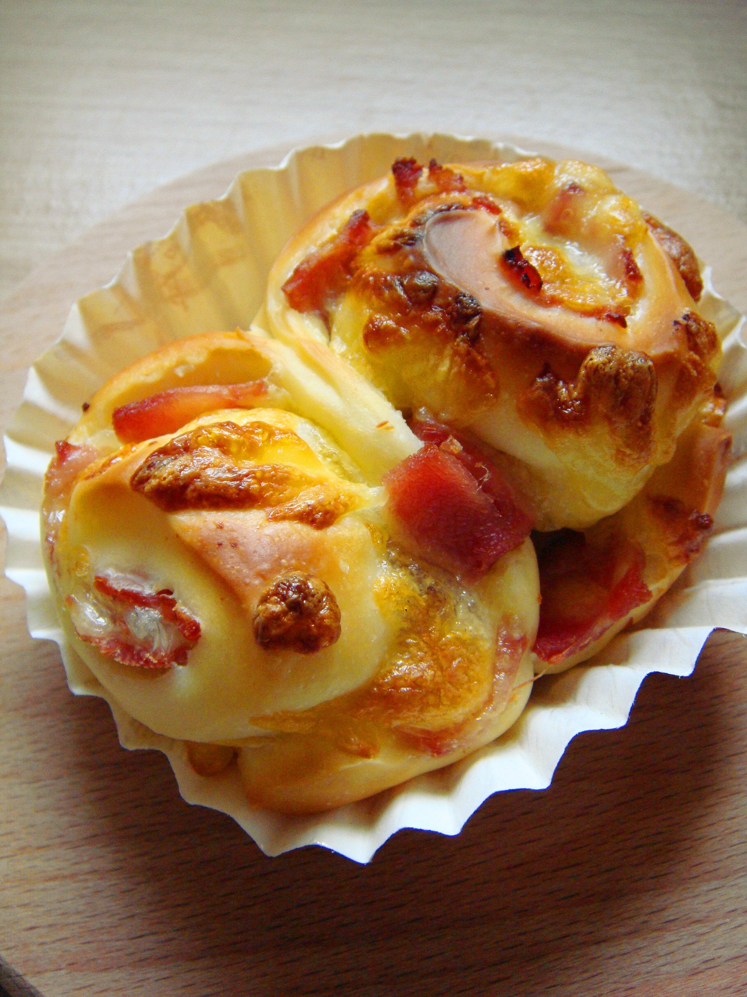 弥修 做过 培根乳酪小面包 #This is baking time#终于用了在香雪家买的日本粉粉,不知道是粉的原因还是方子本身,成品特别软!!真的软到不行!!拍完又被俺吃了... 2014-01-21