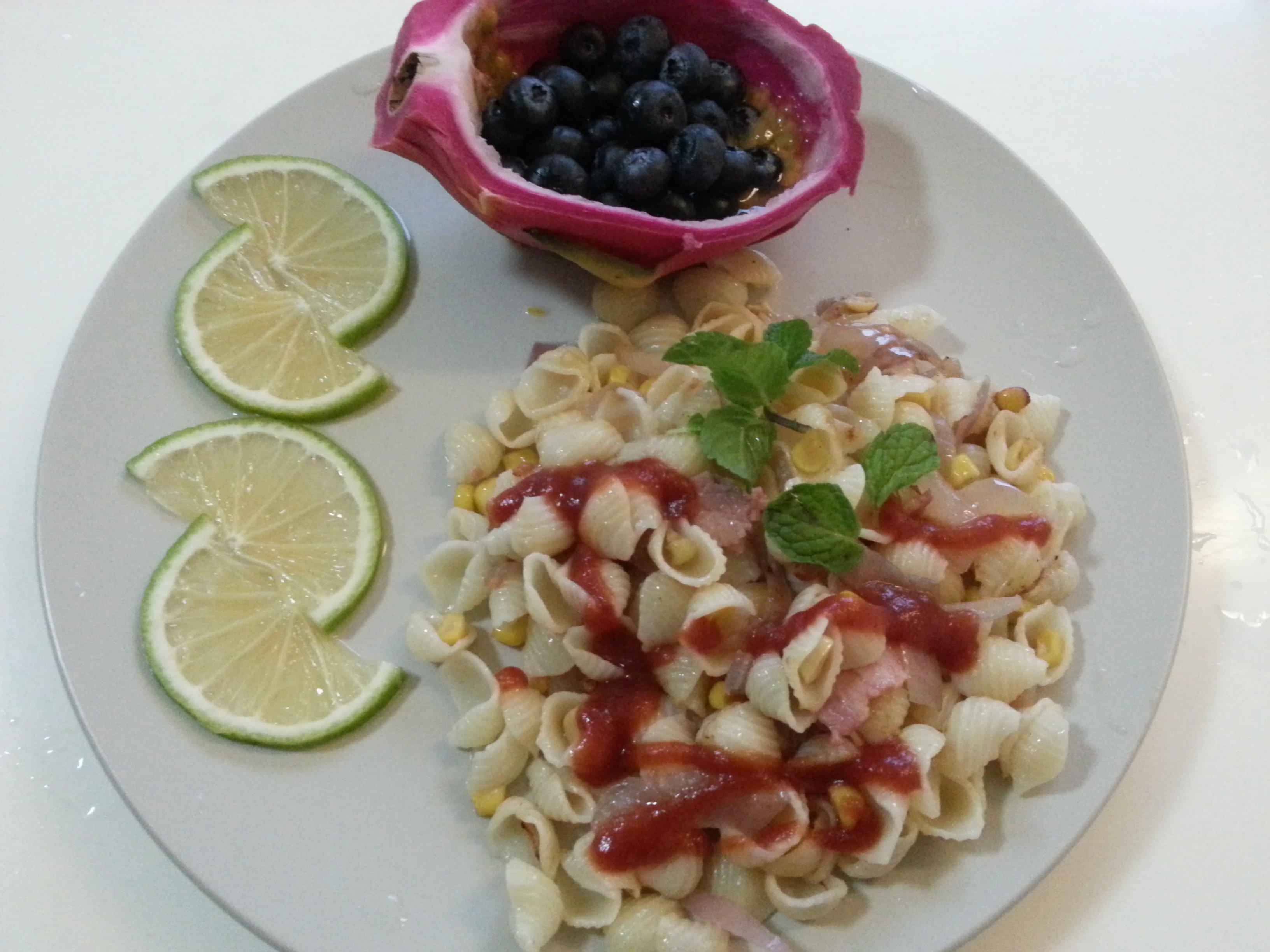 培根玉米粒炒意面。。点缀青柠 薄荷叶。。