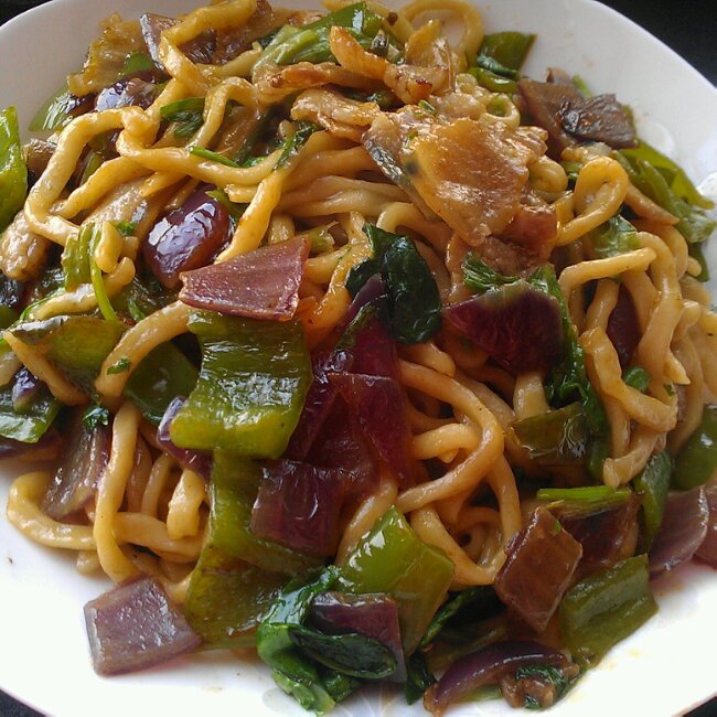 我做的是五花肉炒面,很香呀~