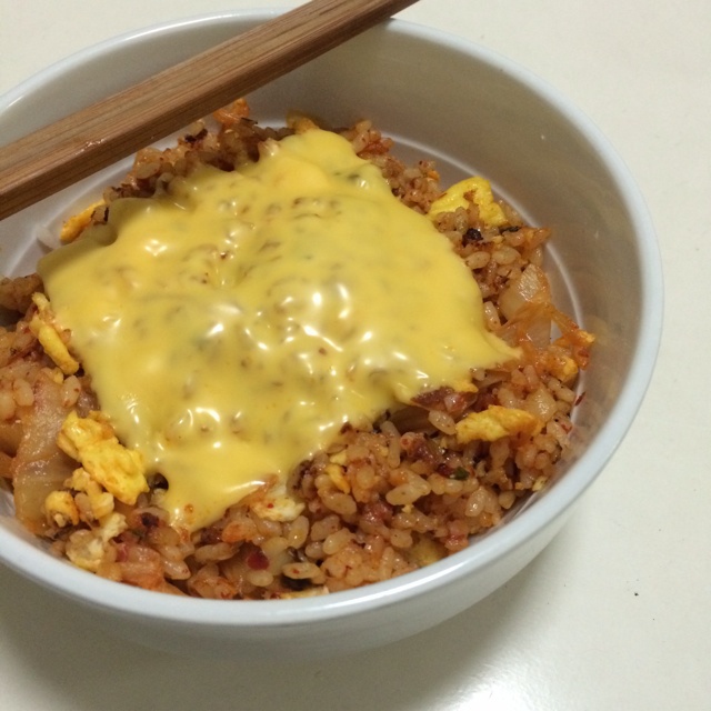 最近禽流感所以把蛋炒熟了才放进去,辣白菜味道好正,芝士用烤箱烤了一下也蛮好吃的。