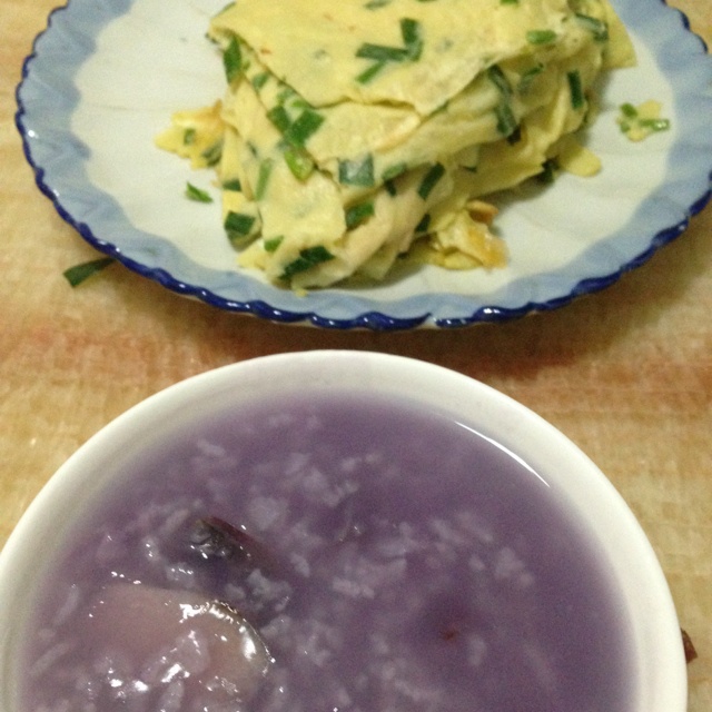 紫薯山药粥,鸡蛋韭菜饼