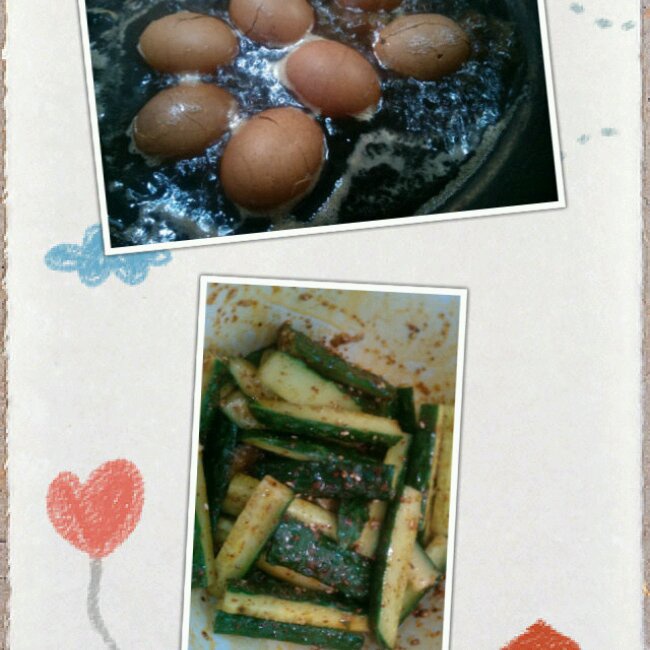 为明早的早餐提前做准备,清明怎么少得了鸡蛋呢,配上清爽小黄瓜,明早只要再做一点玉米甜饼和豆浆就好了(^_^)