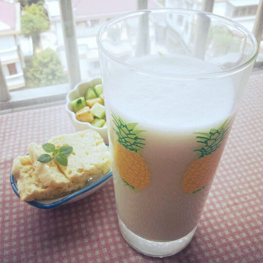 老妈蒸蛋糕+青瓜香蕉沙拉+水果脱脂奶昔=春日里的黄绿色