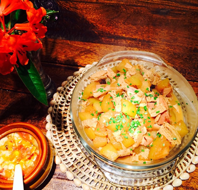 昨天做的德国烤猪肘炖冬瓜冻豆腐~没香菜放了点自己种的蒜苗~