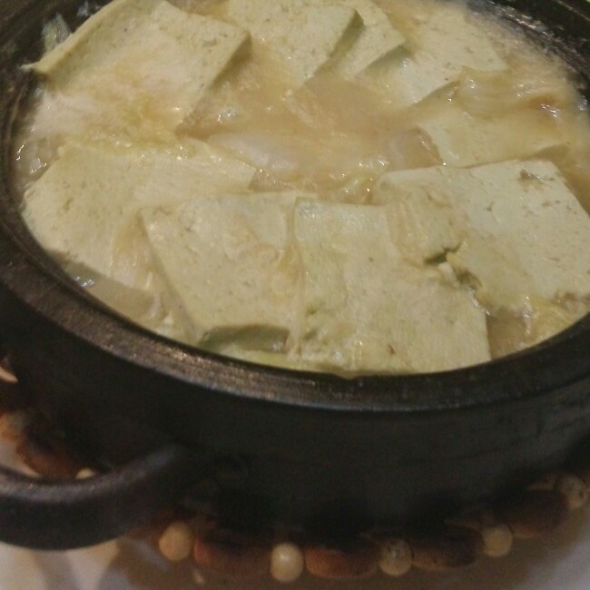 石锅豆腐,下面有白菜和五花肉,味道鲜美
