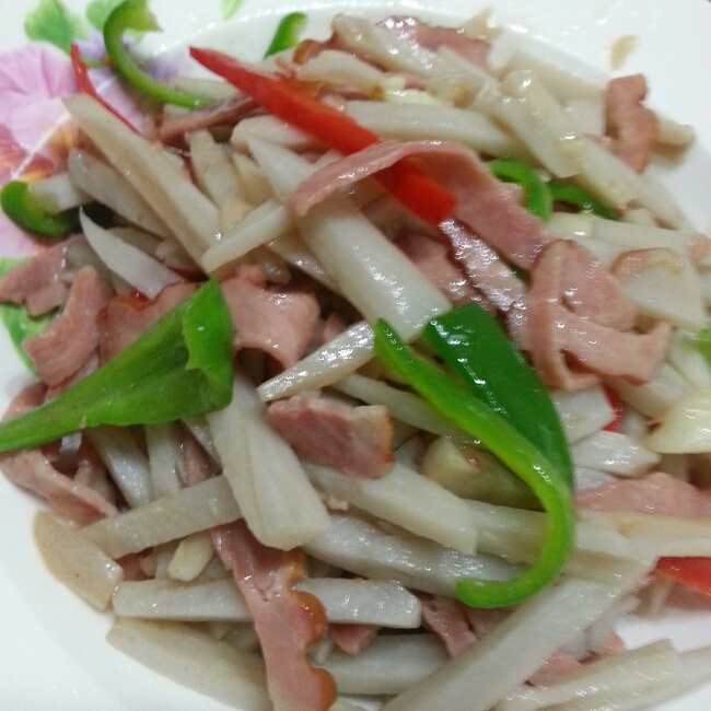 用培根炒的,加了青红椒配色。