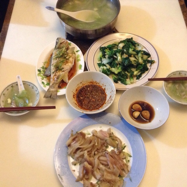 凉拌猪耳 丝瓜肉丝汤 蒸鱼 青菜 还有两颗早上捞出来的糖蒜