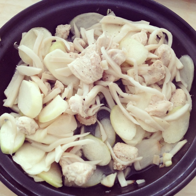 茭白,鸡腿菇,鸡胸肉,大蒜,盐,黑胡椒,油,没想到味道这么好!