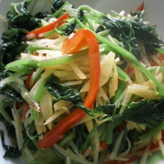 大叶芹土豆丝。大叶芹是当地一种时令山野菜,绿色清爽。