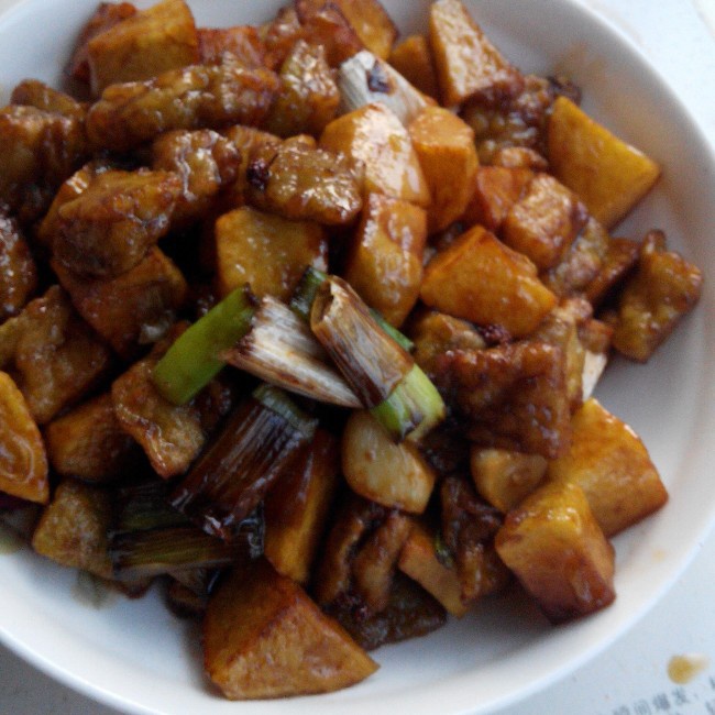 用葱烧的方式烧茄丁和土豆丁