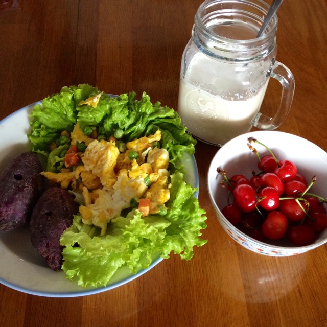 BerylGuan_漫步雲海 做过 早餐•2014年5月21日 #早餐•2014年5月21日#清晨运动完毕的减脂早餐!烤紫薯,田园鸡蛋碎搭生菜,樱桃,脱脂奶咖!要像女王一样吃早餐! 2014-05-21