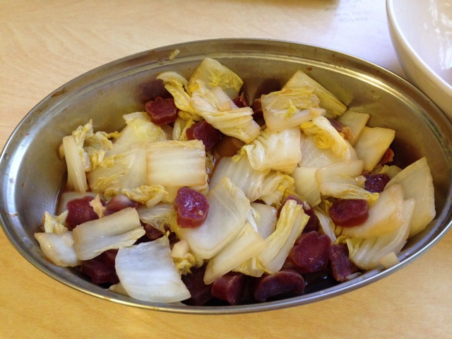 腊肠炒白菜,放了点醋,加了个辣椒,下饭菜