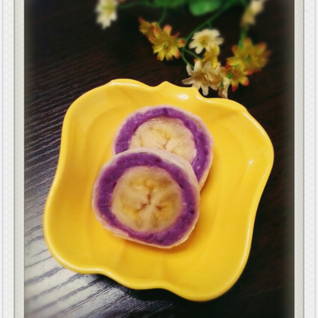 风快哉a 做过 香蕉紫薯卷 #晚餐•2014年6月8日#家里水漫金山,打扫了四个小时,快累趴下了,上午做的小食,先填下肚子~~惯例,又往紫薯里面加了爱吃的芋头----紫色继续不均匀中。 2014-06-08