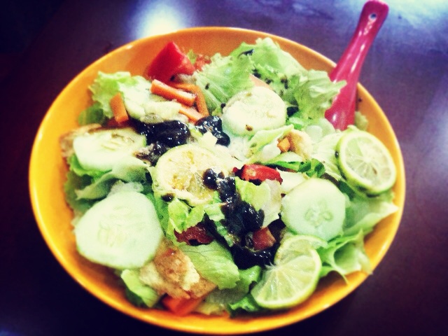 生菜+黄瓜+蕃茄+青柠+胡萝卜+面包屑,最后淋上黑胡椒汁和黑醋