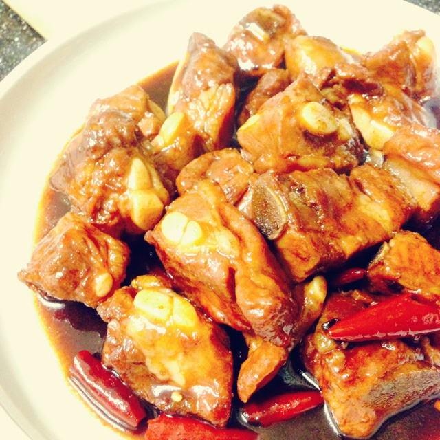 加点辣椒更爽。排骨有点难啃下来 估计是没有腌过或者是煮得时间不够?