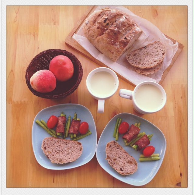 肥虫大爱Q 做过 两人食•早餐 #两人食•早餐#又做了一个欧包,哈,最近很爱这一款。这次用了一半面包粉和一半全麦粉,而且放了足足的核桃和葡萄,无油,很是健康的调调。主要是发酵和重新整形的过程很有意思,四五个小时,反复折叠又等待重新变大。煎些芦笋培根卷,配两个小番茄,再打一杯纯正浓香的豆浆。嗯~很甜很满足的口感 2014-07-04