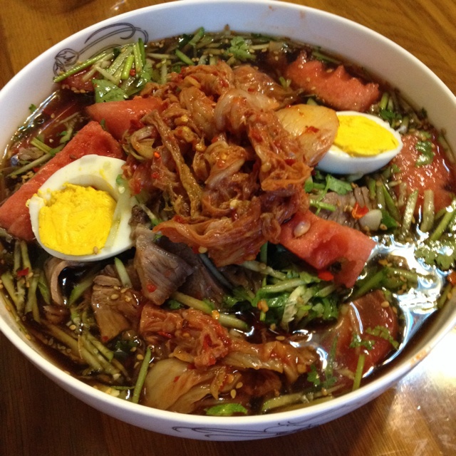 老爹的作品,私房大冷面!加了牛肉,茶蛋,肠,还有西瓜!料都超级足啊,到外面卖指定亏本!