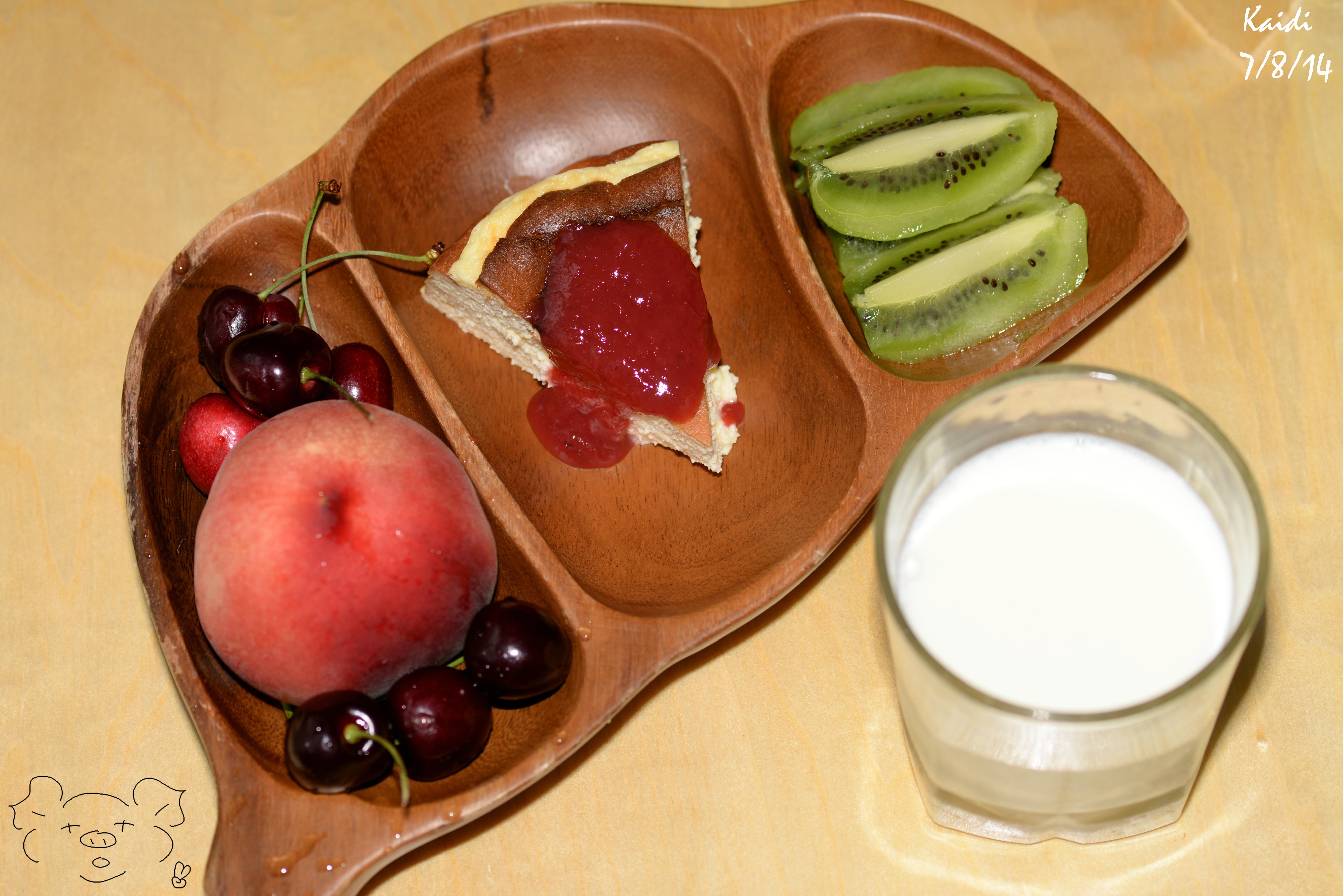 Kaidi 做过 一粥一饭 早饭:舒芙蕾乳酪蛋糕配自制草莓酱+猕猴桃+桃子+樱桃+牛奶 吃完早饭去学校,开会的时候又吃了一个贝果抹蓝莓奶油奶酪,好好吃,撑死了~ #一粥一饭# #午餐•2014年7月9日# 2014-07-09