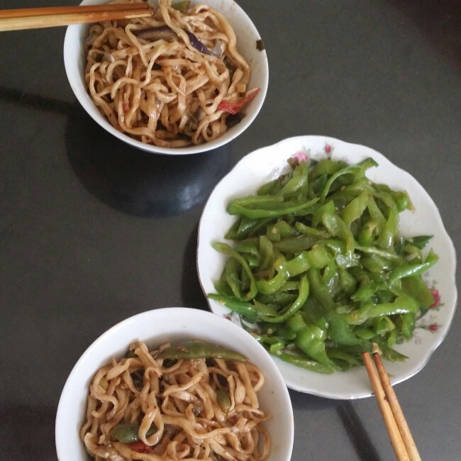 豆角茄子焖面,加,炒尖椒一盘