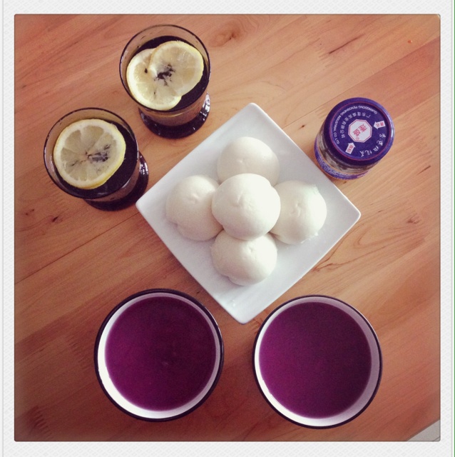 超级简单的早餐,紫薯大米粥,奶黄包。柠檬水。橄榄菜。