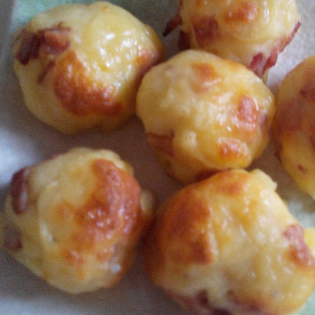 土豆泥里放点盐,撒多点芝士粉拌匀,球上盖上马苏碎,啧啧~啥也不说,自己想象吧