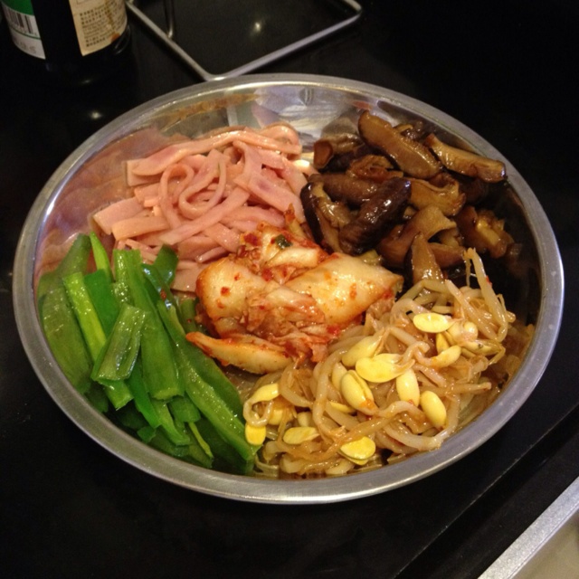 准备做挚爱拌饭,先把配菜准备好,炒香菇、火腿、青尖椒,再挖一些泡菜和腌豆芽,五彩缤纷~