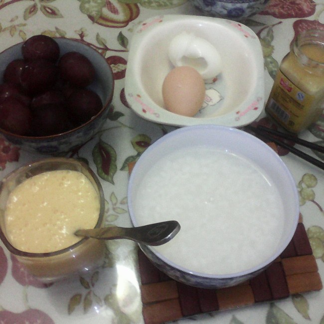 白粥,鸡蛋,葡萄,芒果奶昔,腐乳。