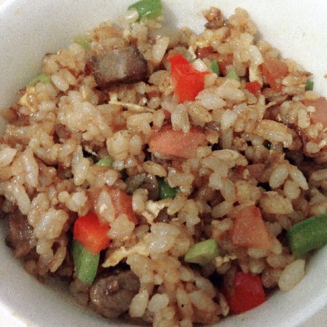 牛肉粒,火腿粒,彩椒粒,鸡蛋的酱油炒饭