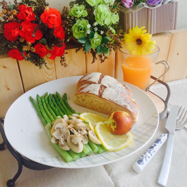 早餐:白芍芦笋,蘑菇相伴,相邀柠檬,冬枣作客,老友欧包昨晚来席,周末不孤单,早安!