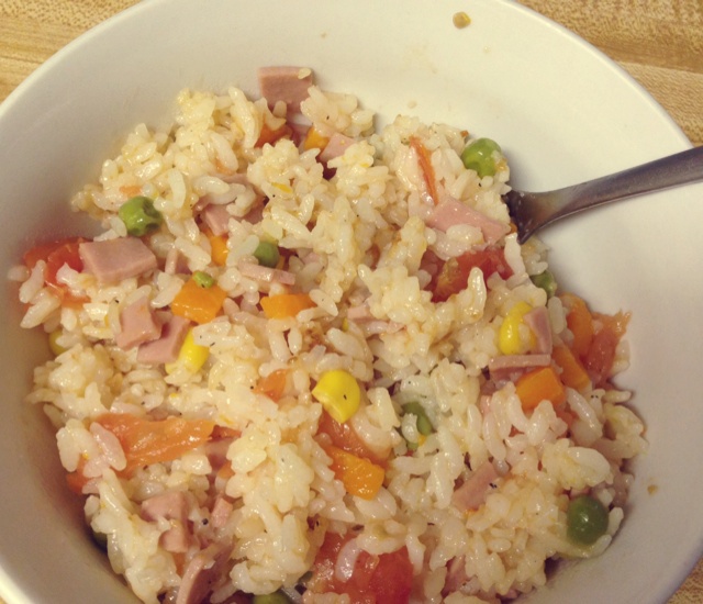 简单快捷又美味!加了火腿、胡萝卜丁、豆子和玉米粒~最后把番茄爆酱的感觉好爽,哈哈!微酸的清爽口感,以后会经常做。