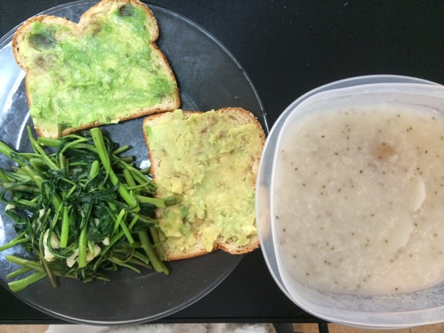 山药芝麻粥,牛油果抹面包,蒜蓉空心菜~