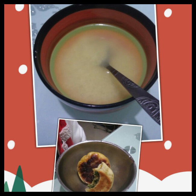 2个小水煎包 一碗小米粥 女儿的早餐 还没照相呢水煎包就被女儿咬了一口~~