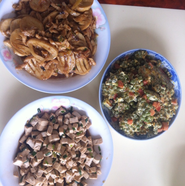杏鲍菇炒肉,豌豆炒蛋炒火腿肠,小葱伴豆腐,虽然卖相不咋滴,但是味道真心不错!
