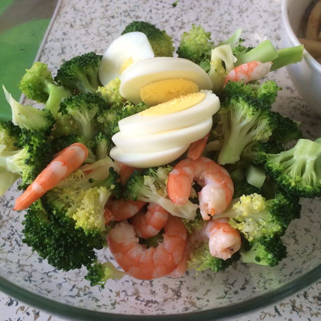 没有用油炒,西兰花焯水至熟,虾是自己煮了剥出来的,配一个白煮蛋,放油醋汁拌匀,是清爽的沙拉吃法。