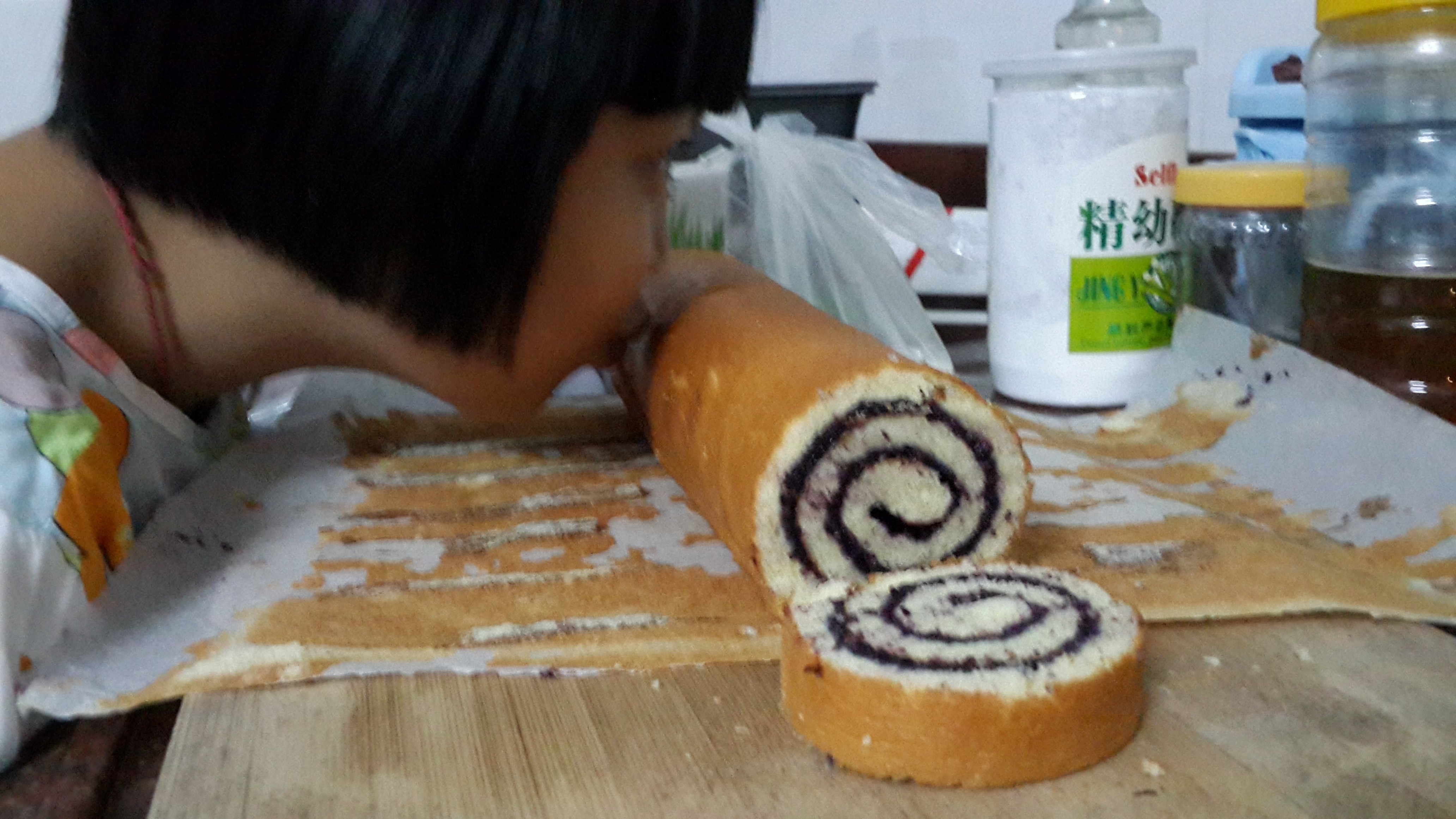没有奶油水果用了蓝莓果酱,蛋糕卷胚大家都喜欢,不会裂