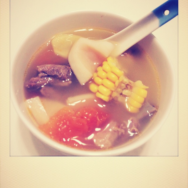 第一次尝试在羊排玉米莲藕汤里加了番茄,味道很赞,成功!