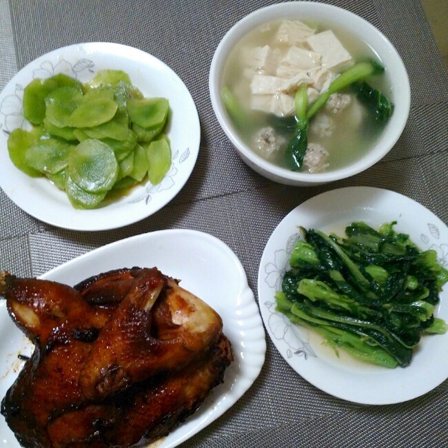 凉拌莴笋,清炒莴笋叶,冻豆腐肉丸汤,酱油焗鸡