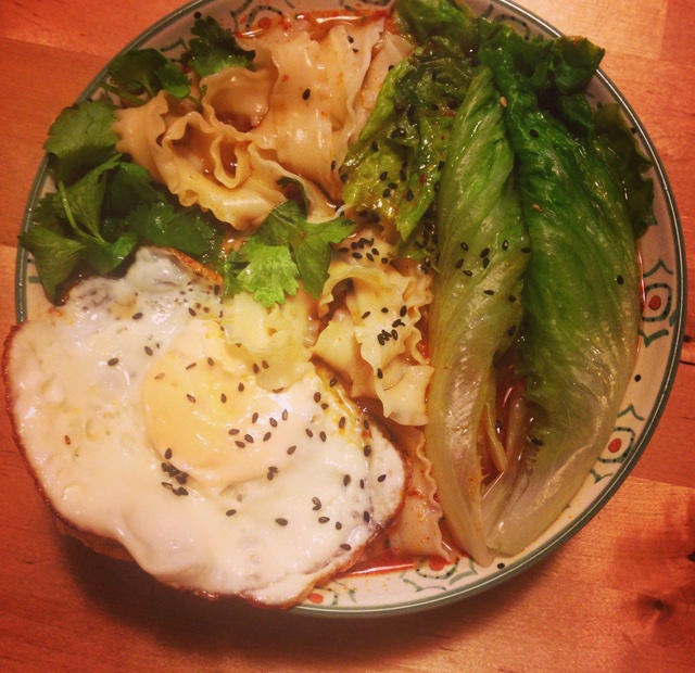 白日梦女士 做过 超级无敌美味懒人酸汤麻辣面(十分钟搞定色香味俱全) 名副其实的快手面!前后只花了五六分钟就吃上了!锅里煮着度小月刀削面,再煎个底部脆脆的鸡蛋,烫一把生菜,撒点熟芝麻。在外面下雨阴冷懒得买菜的冬天,有碗酸辣热气腾腾的面条裹腹,十分满足。 #晚餐•2014年12月10日# 2014-12-10