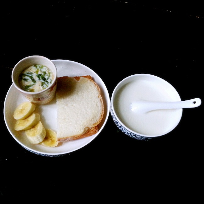 周末早上吃清淡点,牛奶+茶碗蒸+面包+香蕉,,,