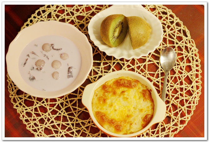 焗土豆泥+紫薯牛奶小圆子+猕猴桃