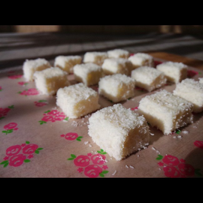 __Aries 做过 完胜85度C牛奶椰丝小方 倒在布朗尼模具里面成型的脱模砸了半天砸不出来我就知道还不是很成功周围全部撒上椰蓉脱模口感不是入口即化的赶脚倒是有点Q弹不过还是很好吃啦~算是有点安慰*^_^*#午餐•2015年1月7日# 2015-01-07