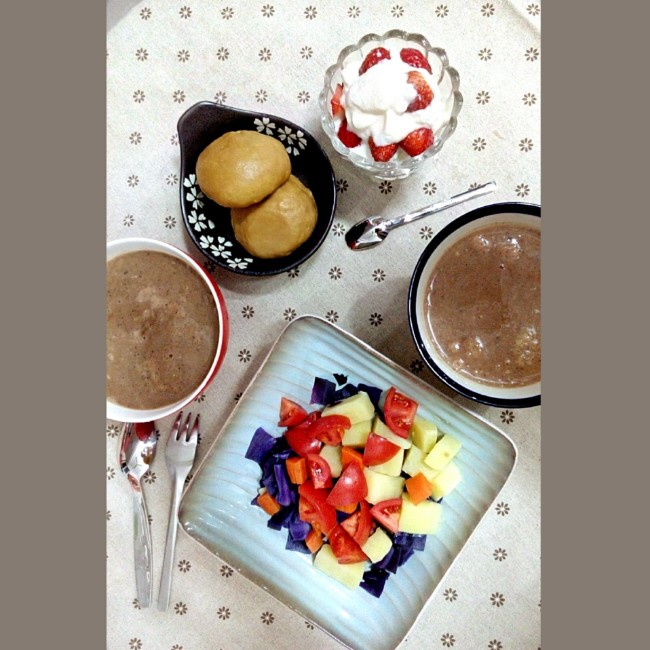 空白-241 做过 早餐•2015年1月29日 #早餐•2015年1月29日#红糖馒头+胡桃黑豆鹰嘴豆燕麦荔枝干玉米糊+西红柿紫甘蓝土豆胡萝卜沙拉+草莓酸奶虽然我忙忙碌碌弄了这些,但是小主不喜欢,她只要吃肉粽!!婴儿食品也不碰!一大盆沙拉我一个人默默吃完……明天还是得换个合她胃口的。#美好一天从早餐开始# 2015-01-29