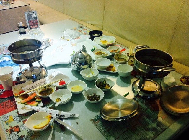 点了两盘肉一份虾滑一大筐菜两个半份蘑菇、还送了好多盘、还去夹了好多免费小菜和水果、连自助调料都不放过各种口味都装了小半碗、