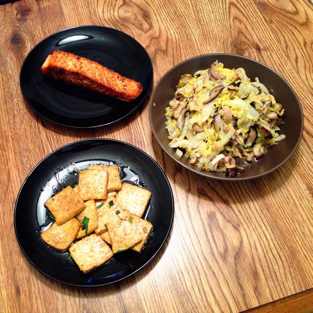 香煎三文鱼+黄芽菜炒肉丝+红烧豆腐。豆腐是煎好三文鱼后剩油洗锅的产物哈哈。