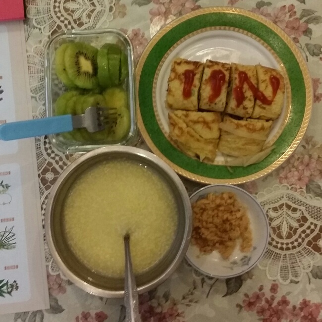 鸡蛋土豆牛肉卷饼,小米粥,猕猴桃,做饭速度越来越快了,15分钟完成